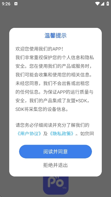2、首先请同意用户协议和隐私政策;