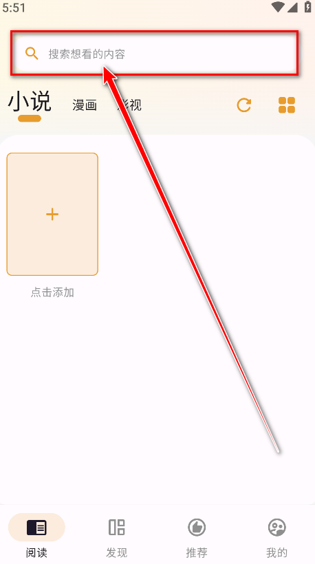 1.打开猫番阅读,点击上方的搜索框,接着输入关键字,即可找到我们想要的小说或者漫画资源。