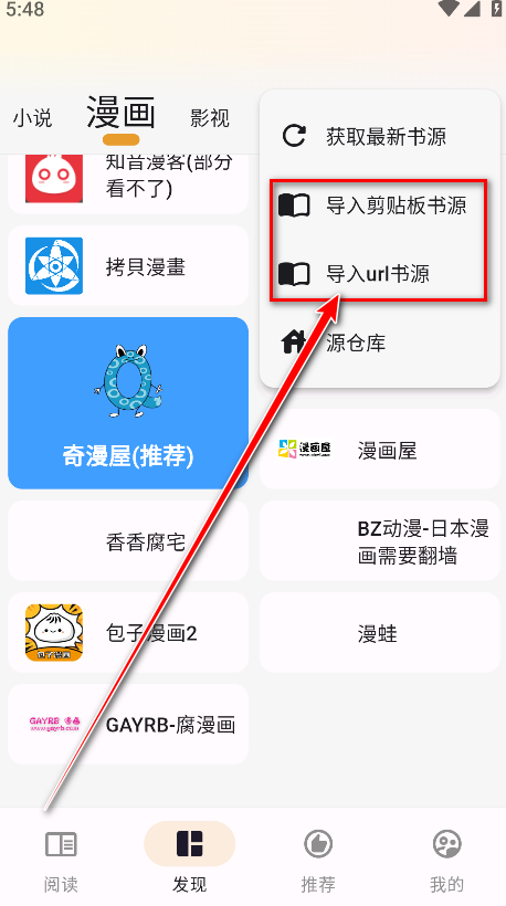 3.点击导入剪贴板书源或者导入url书源,小编以点击后者为例。