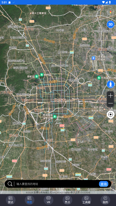 用户点击地图,可以查看自己位置的卫星地图,并且可以精确到用户当前的位置,点击上方搜索框还可以自己搜索位置。