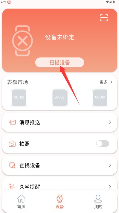 2.在设备管理界面开启手机蓝牙功能,点击扫描设备按钮搜索并绑定智能穿戴设备。