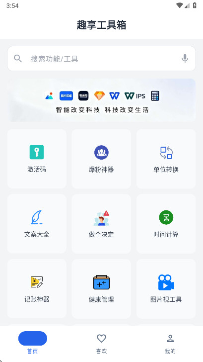 1.打开趣享工具箱App,进入首页可以看到丰富的实用工具