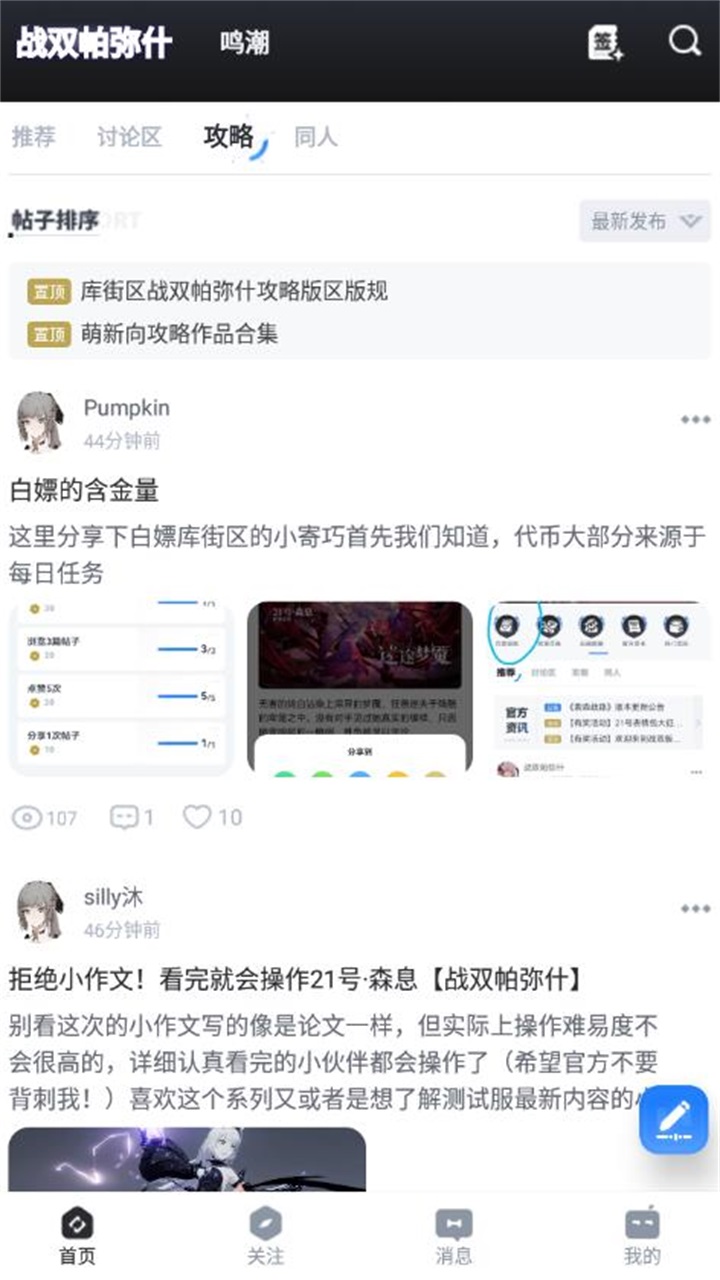 2、首先,作为一个游戏社区,库街区为用户提供最新的游戏资讯和动态,方便用户快速获取游戏关键信息,如提供【推荐】、【讨论区】、【攻略】、【同人】等不同的内容版块。