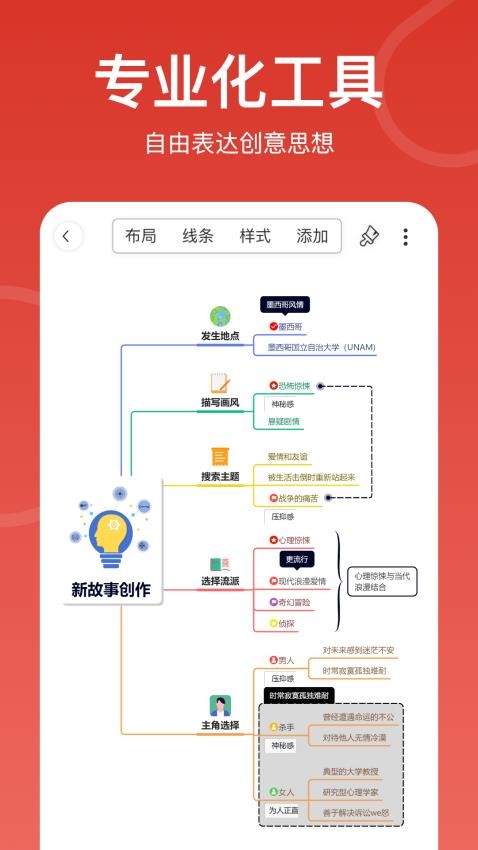 九种线条随意选择,多种样式自由搭配,自定义风格快速引用摘要、成块、关联、图片、图标、备注、链接、素材库、声音都可添加,还可随意手写