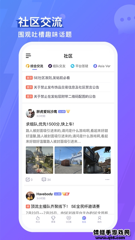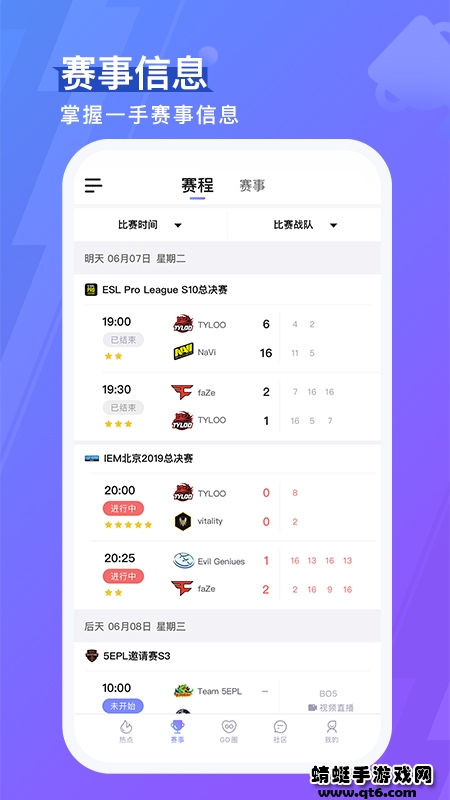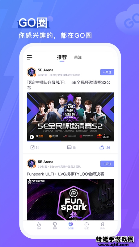 5Eplay手机版app是一款实时为用户提供最新电竞资讯的平台,这里有众多的电竞赛事新闻,提供很多的比赛信息让用户去了解,还有相关的游戏资讯,让用户一手掌握,精确的查找了解比赛信息,同时还有各种直播录像随时看,用户再也不怕错过电竞赛事了。