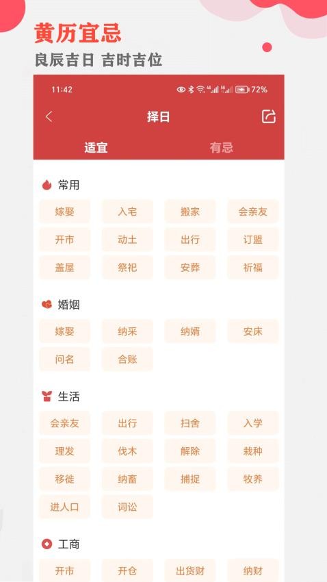 用户可以通过黄历宜忌来查询吉日,方便挑选吉利日子使用。