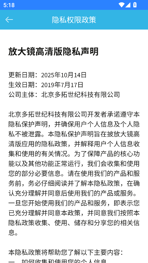 1.打开放大镜高清版app之后,点击同意隐私政策。