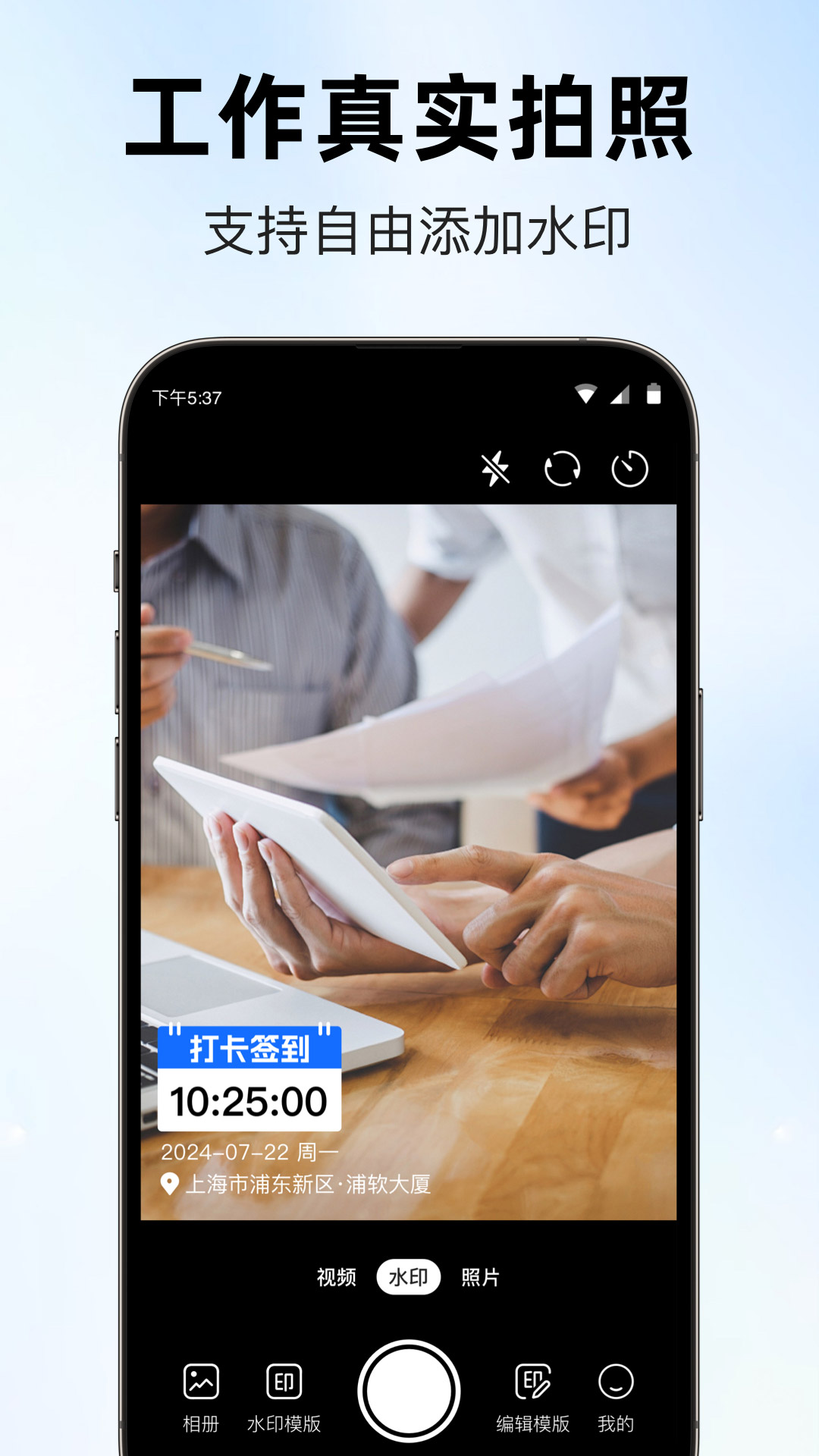 随时随地水印相机安卓版下载安装最新版本是一款功能强大的工作拍照打卡软件,软件拥有海量水印模版,支持支持多种记录形式,还可以自定义水印,可以帮助用户更好的水印拍照,随时随地水印相机,时刻记录你的生活!