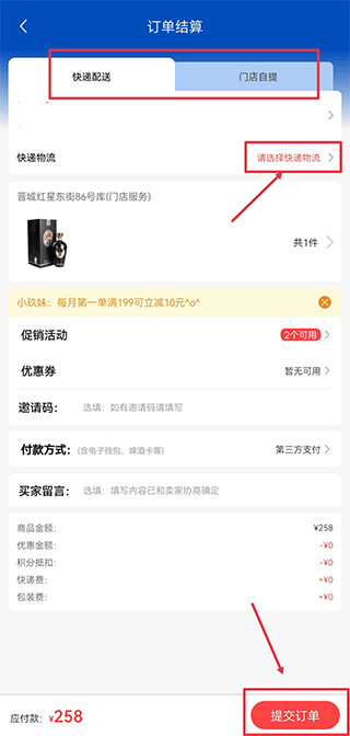 4、选择门店自提或者是快递配送就可以下单购买了。