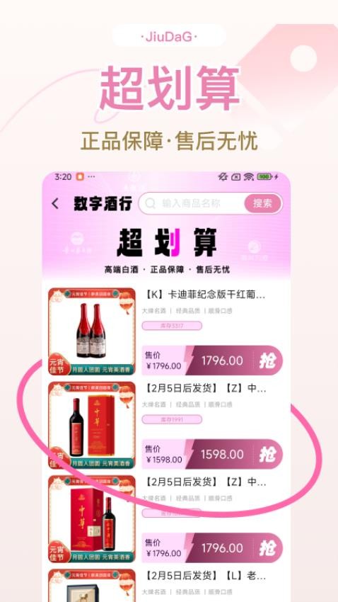 酒大G官方版app是一款提供专业卖酒的平台软件,软件为用户提供了知名的贵州习酒,这里的高端酱香习酒都可以进行筛选预览,找到自己需要的白酒进行下单选购,轻松进行购买,并且这里的名酒还划分了详细的分类,让你可以进行红酒、白酒、葡萄酒的选购下单,轻松找到自己需要的酒产品进行购买。平台还为用户提供了海量的补贴,用户可以在线领取补贴进行折扣下单,享受折扣优惠,省钱的进行购买。此外,酒大G最新版中的白酒商品都是正品行货,对用户的订单也会进行售后无忧的展示,超划算的进行购买,有需要的用户就赶紧来本站下载使用吧!