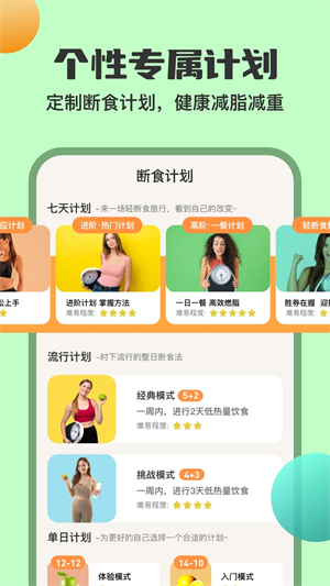 量身打造断食计划:断食计划的强度层次分明,简单的体验12-12、14-10,受瞩目的明星计划16-8、具有一定难度的18-6、20-4等计划,为用户提供多阶段的断食计划,参考不同阶段与身体的适应度,选择适合自身的计划并体重小本记录,让您更快更高效的减肥瘦身、健康身体。