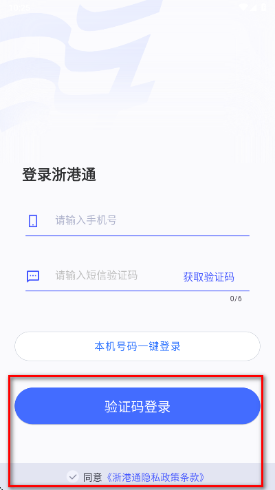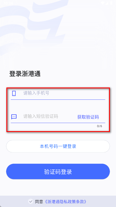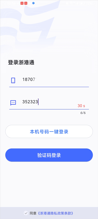 1.打开浙港通,输入自己的手机号和短信验证码。