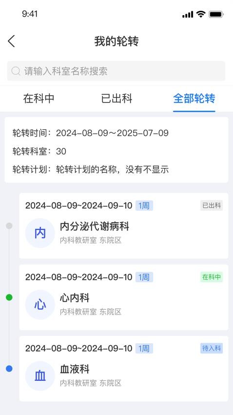用户也可以随时随地的查看医院科室的轮转,就可以查看我的轮转,掌握全部的轮转。