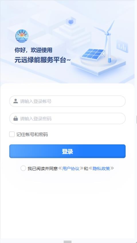 1、在线下载并打开元远绿能APP,即可输入账号和密码登录使用;