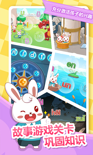 4、寓教于乐:将知识点融入在游戏关卡中,只有学会了相应的知识点才能过关。让孩子玩游戏的过程中不知不觉学会拼音。