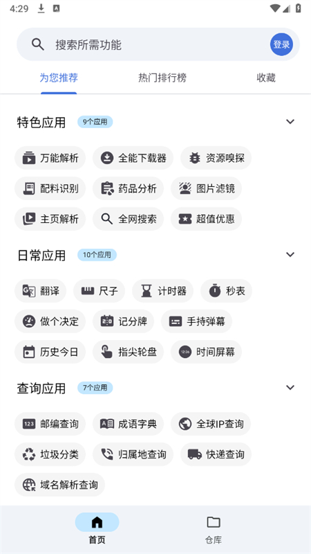 1.在本站下载安装好奇妙工具箱app,运行软件,可以看到有各种热门功能;