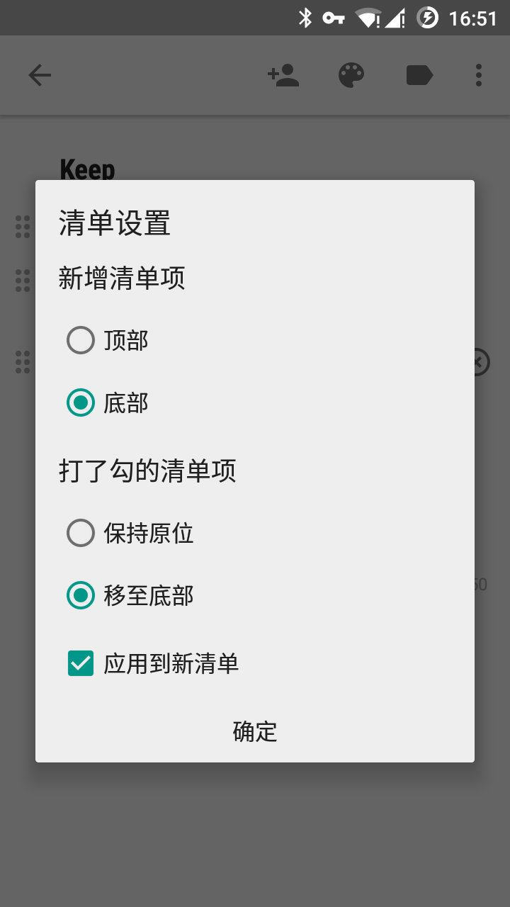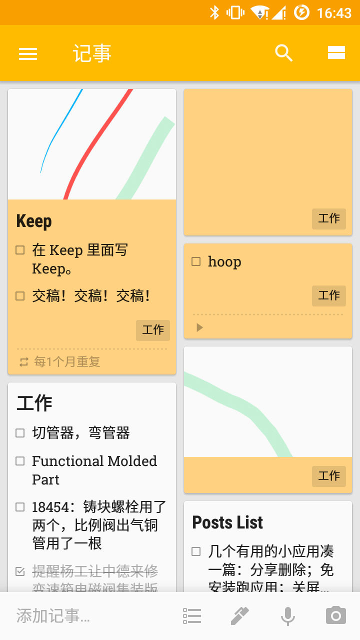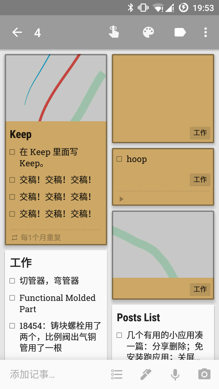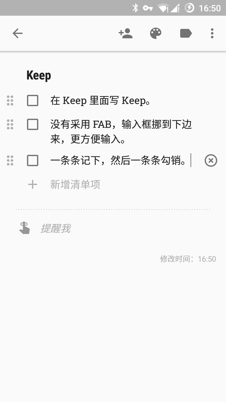 从大类上来讲,Keep 的记事类型有普通记事和清单记事两种。普通记事不能实现图文混排,只能实现图文分离排布,所以我偶尔会用普通记事打打文字草稿;清单记事日常用的比较多,列一些购物清单、文章题纲、待办事项等等都是极好的。在清单记事中,可以对清单进行一定的自定义设置,使之更符合自己使用的一些习惯。之前在试着用 Parchi 替代 Keep 时,打了勾的清单项会保持原位,又没个可以调节的地方,这也让我一度不习惯。