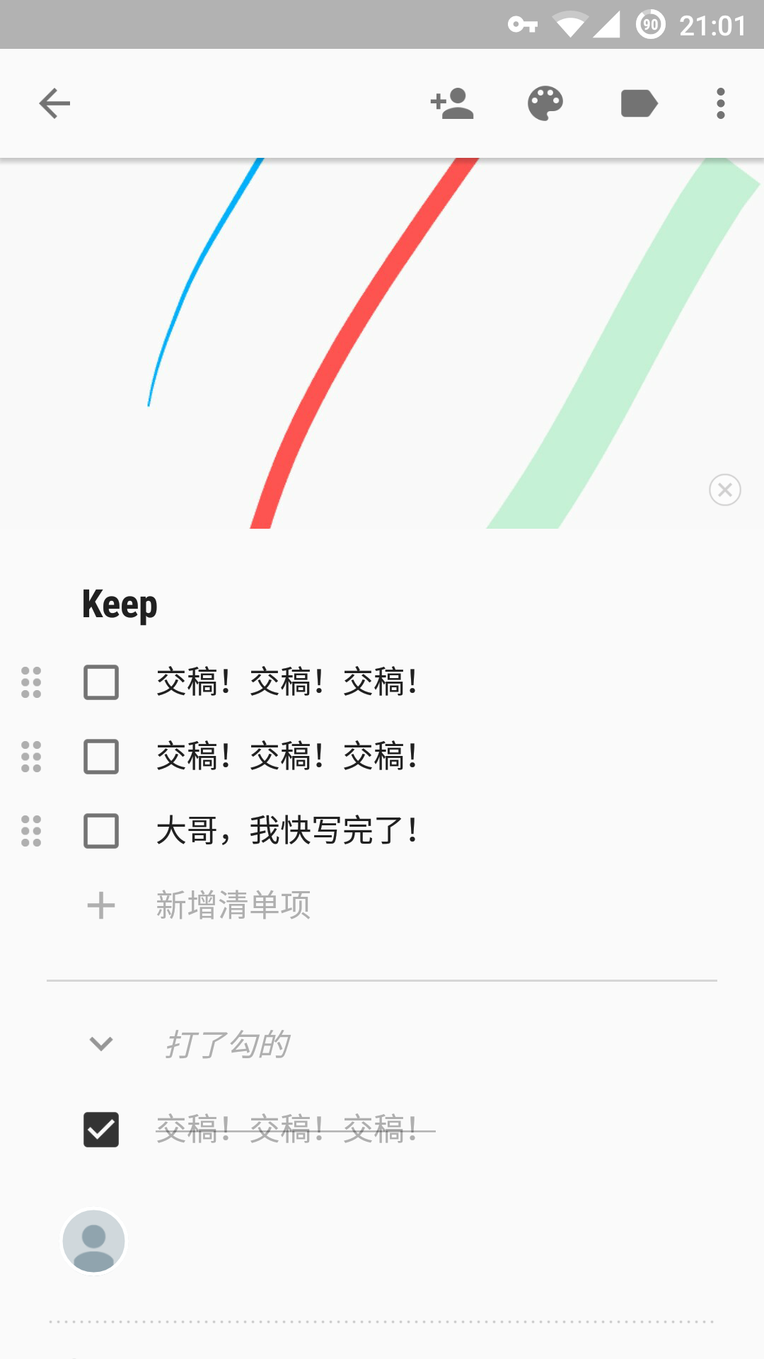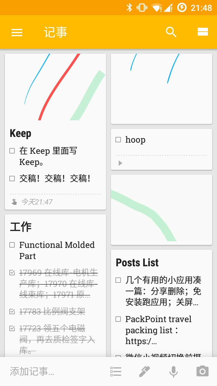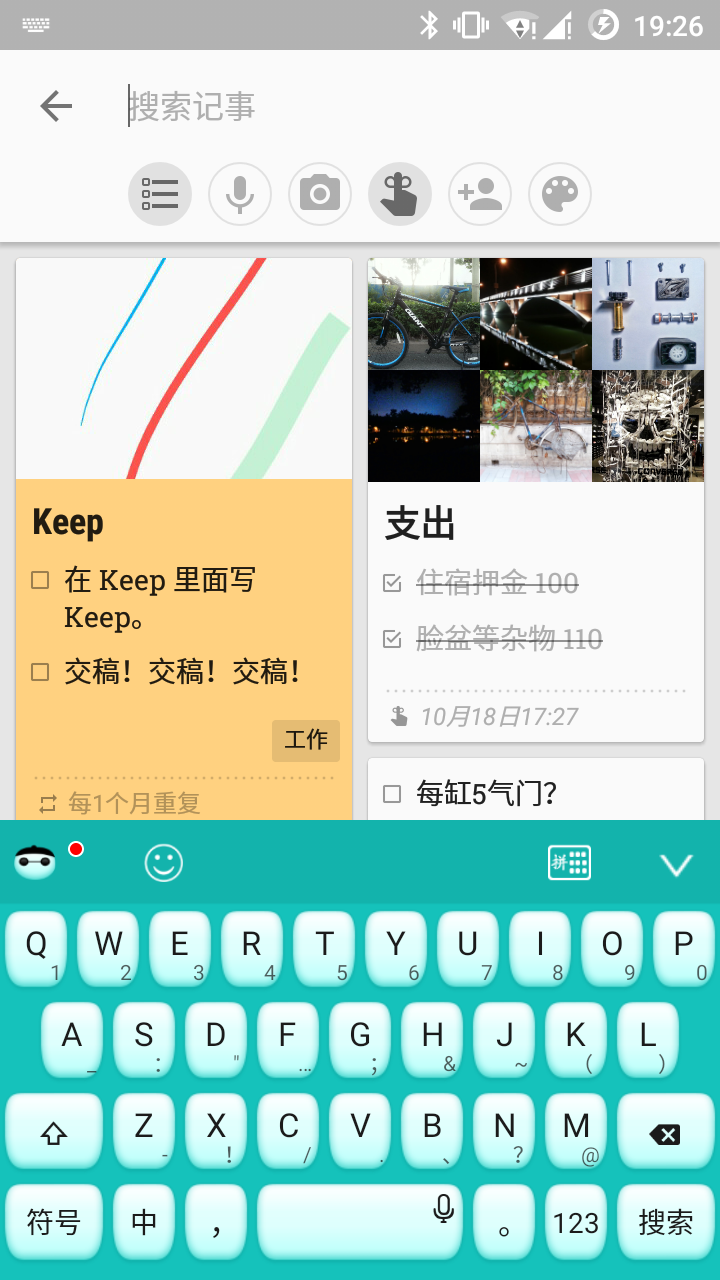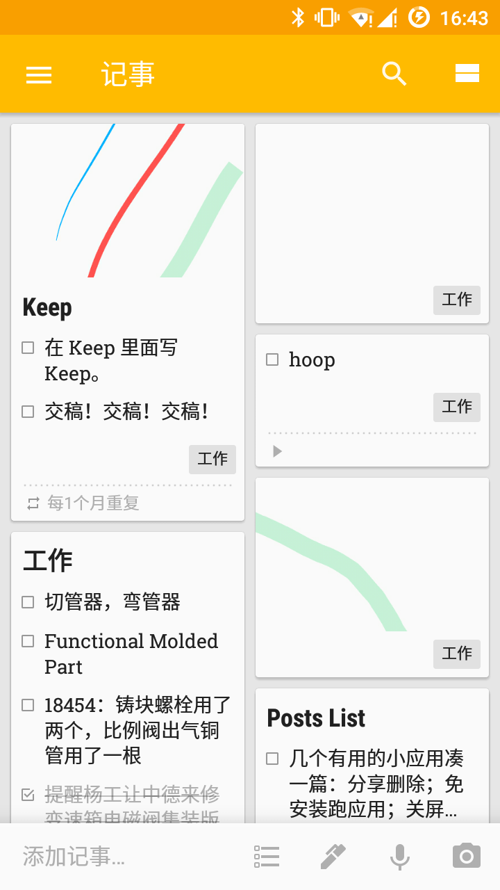 从大类上来讲,Keep 的记事类型有普通记事和清单记事两种。普通记事不能实现图文混排,只能实现图文分离排布,所以我偶尔会用普通记事打打文字草稿;清单记事日常用的比较多,列一些购物清单、文章题纲、待办事项等等都是极好的。在清单记事中,可以对清单进行一定的自定义设置,使之更符合自己使用的一些习惯。之前在试着用 Parchi 替代 Keep 时,打了勾的清单项会保持原位,又没个可以调节的地方,这也让我一度不习惯。