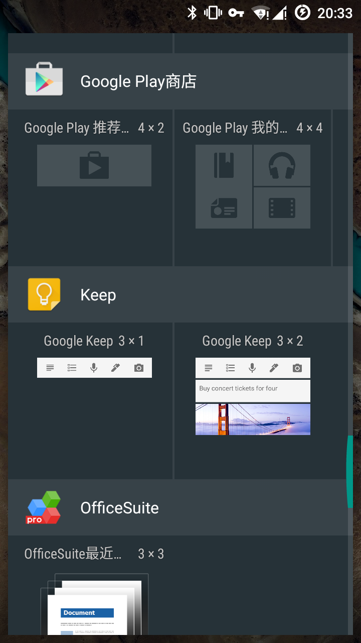 这种应用再没有桌面小部件,那就得遭不少人怨了。Keep 桌面小部件的功能,一是作为进入应用子功能的快捷入口,二就是显示部分记事内容。Keep 有两种尺寸的桌面小部件,3×2 和 3×1,3×2 可以缩成 3×1,3×1 就不能扩成 3×2 了。小部件的颜色就这一个样,没有透明或其他颜色可选,单独拉伸填满一屏,与 Google 即时桌面融合的挺好。