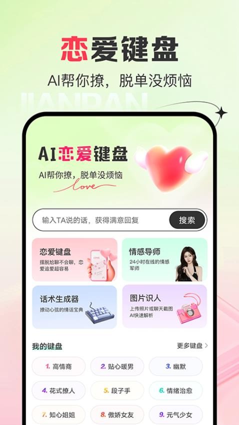 AI恋爱键盘软件免费版是一款功能强大的智能键盘软件,软件可以帮助用户进行恋爱的回复聊天,这里会根据对方的话语来推荐更合适的回复选项,用户可以一键自然流畅的聊天,并且还有实用的话术生成器,帮助用户可以生成需要的话术,这里海量的话术可以满足不同用户的聊天需求,轻松进行恋爱互动。平台还为用户提供了专属的情感导师,对用户可以进行贴心陪伴,随时咨询导师来进行体验。此外,AI恋爱键盘手机版还提供了智能图片解读功能,让你通过图片来洞察人心,可以查看图片中人物的性格分析,轻松解读,有需要的用户就赶紧来本站下载使用吧!