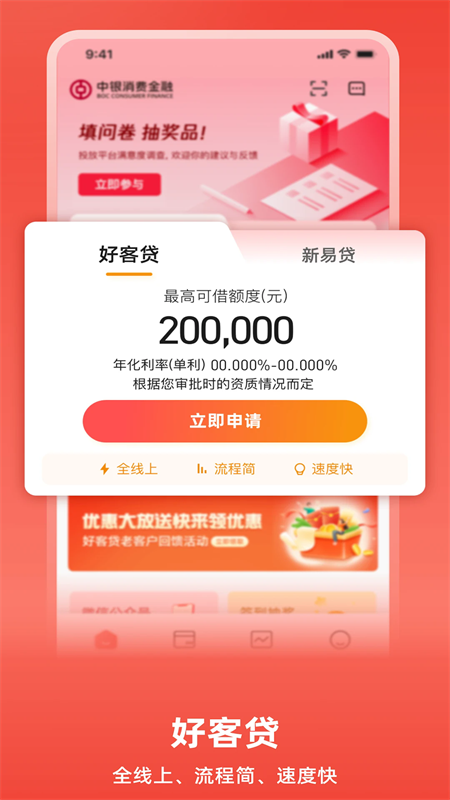 中银消费金融贷款官方版app是一款由中银消费金融有限公司推出的手机网络借贷软件,这款软件不仅受中国银监会监管,是全国首批消费金融公司之一而且也是中国银行旗下产品,相关用户在这里无需抵押,只需提供身份证即可享受安全、快捷的分期借贷服务。另外,该软件的额度非常高,放款效率也很快,确保能够满足绝大多数用户的使用需求。