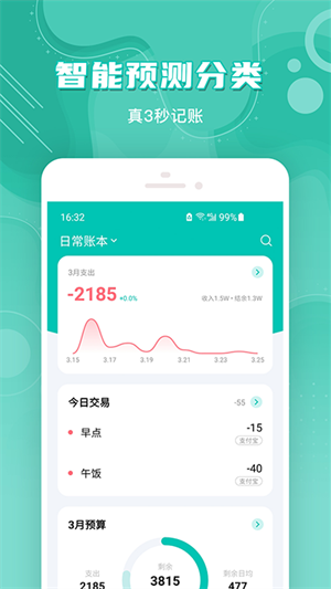 6、预算管理科学合理:能设置月度总预算、分类预算以及二级分类预算,系统自动计算每天平均支出,且支持预算转移、自动结转。