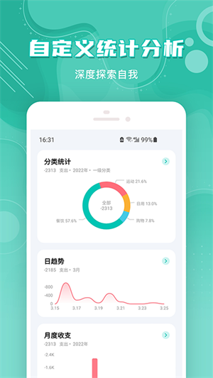 7、统计分析清晰直观:提供现金流、周报、趋势等多种统计视图,通过饼图、条形图、折线图等展示收支数据,还支持自定义统计分析。