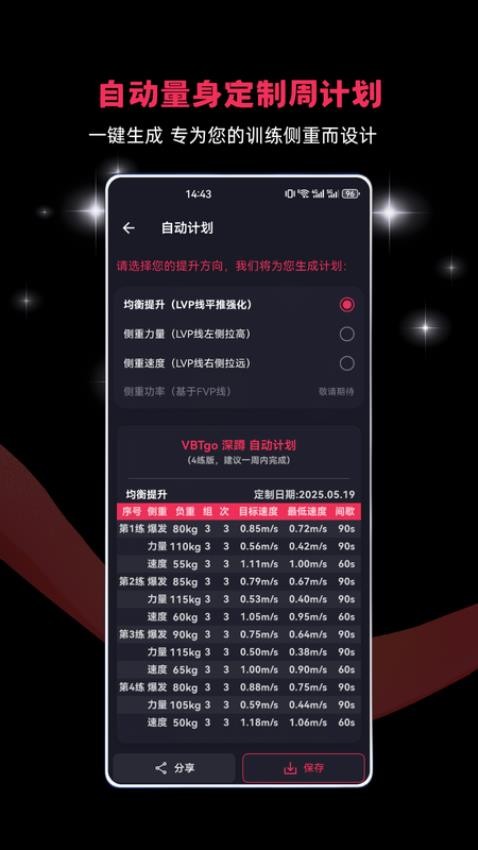 VBTgo软件支持用户轻松运动训练,这里可以随时测量相关的杠铃速度,更好的生成LVP曲线,对其可以精准评估,实时测速播报,一键识别相关的动作速度;并且用户也可以对相关的训练数据实时记录下来,就可快捷记录相关的数据,轻松分析目标速度,生成训练计划。