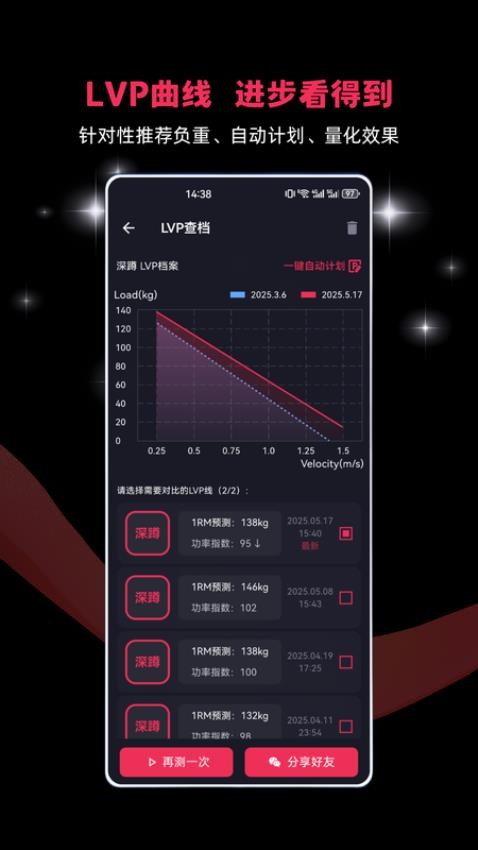 . 自动生成 LVP 曲线:直观了解自身力量-速度进步趋势、预测目标速度、生成个性化计划