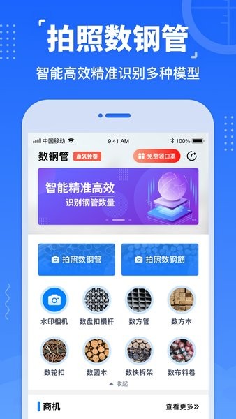 数钢管app直接可以将钢管拍照进行扫描的,就可以快速获取钢管的数量了,对于建筑行业是很有帮助的,而且还可以查询历史记录,更是可以去发现一些商机。