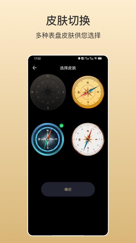 指南针掌上版app是一款专为用户提供多功能的工具箱软件,软件中汇集了多种多样的实用工具,包含了温度计、分贝仪、手电筒等等,从而可以轻松选择需要的工具来便捷使用,而且还有实用的掌上指南针,让你可以随时定位当前的方向,准确获取方向指引,以便可以轻松探索户外活动。平台还为用户提供了丰富多样的表盘皮肤,即可让你轻松选择,找到喜欢的皮肤就能够一键设置,随心切换皮肤,精美的展示。此外,指南针掌上版客户端还支持用户便捷的生活,对生活小助手都可轻松选择使用,享受优质的生活体验,有需要的用户就赶紧来本站下载使用吧!