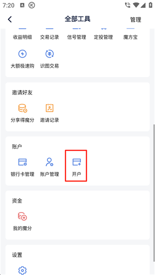 3.进入工具大全界面后点击账户区域的银行卡管理。