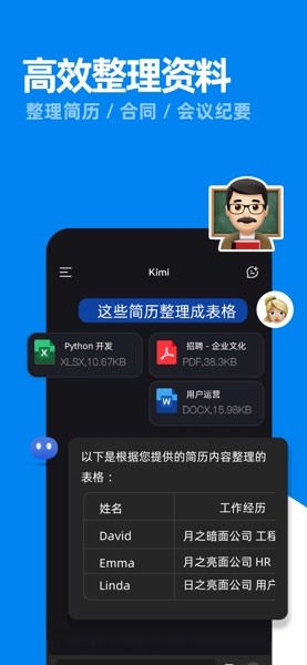 3.专业文件解读:无论是金融、法律、市场调研等领域,Kimi都能以专业水准提供支持,包括超长文档的摘要、翻译、解答,支持多种文件格式上传。