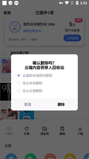 3、这里会让我们确实删除的方式,对于没用的照片就选择云端和本地删除。不想同步的就仅删除云端,不想占用手机空间的就选择本地删除。