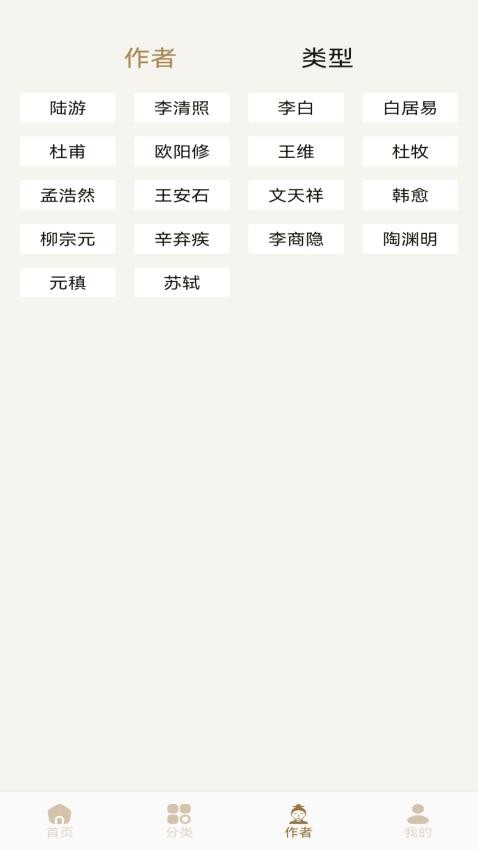 软件中的诗词、作者分类十分齐全,可查看到全类型的诗词内容进行学习。