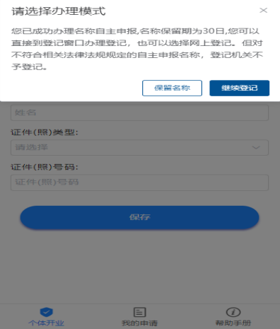 至此已成功办理名称自主申报,名称保留期为 30 日,您可以点击【保留名称】直接到登记窗口办理登记,也可以点击【继续登记】按钮继续网上登记