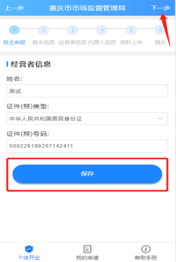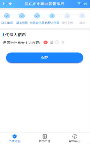 是否为经营者本人办理,点击【保存】,下一步