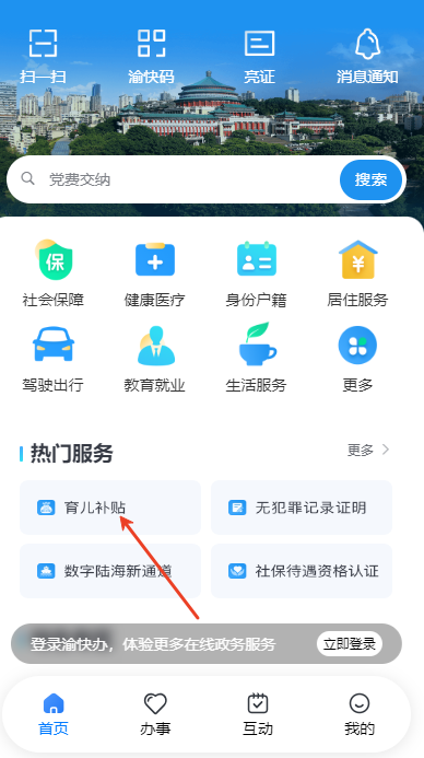 1、进入渝快办app主页面,点击育儿补贴板块