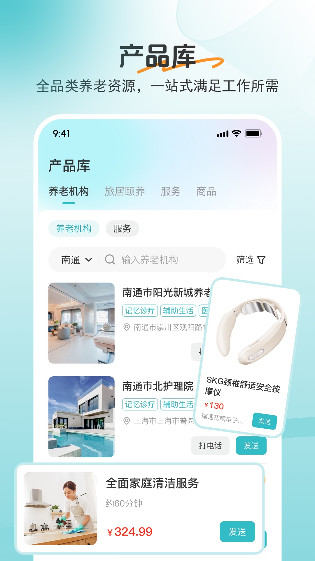 资源对接更灵活:海量养老机构、服务项目、精选商品随心浏览,支持一键分享给客户,看中即可在线下单,签约记录、回访轨迹全程可查,服务闭环清晰可溯。