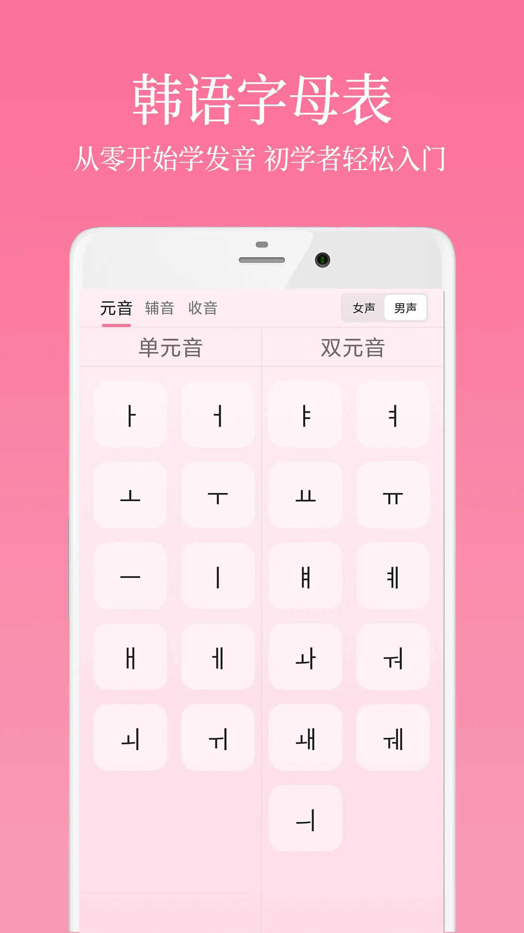 【韩语字母表】精心整理40个韩语字母,每个字母都有真人发音,支持男女发音一键切换,帮你打好发音基础,初学者也能快速入门。