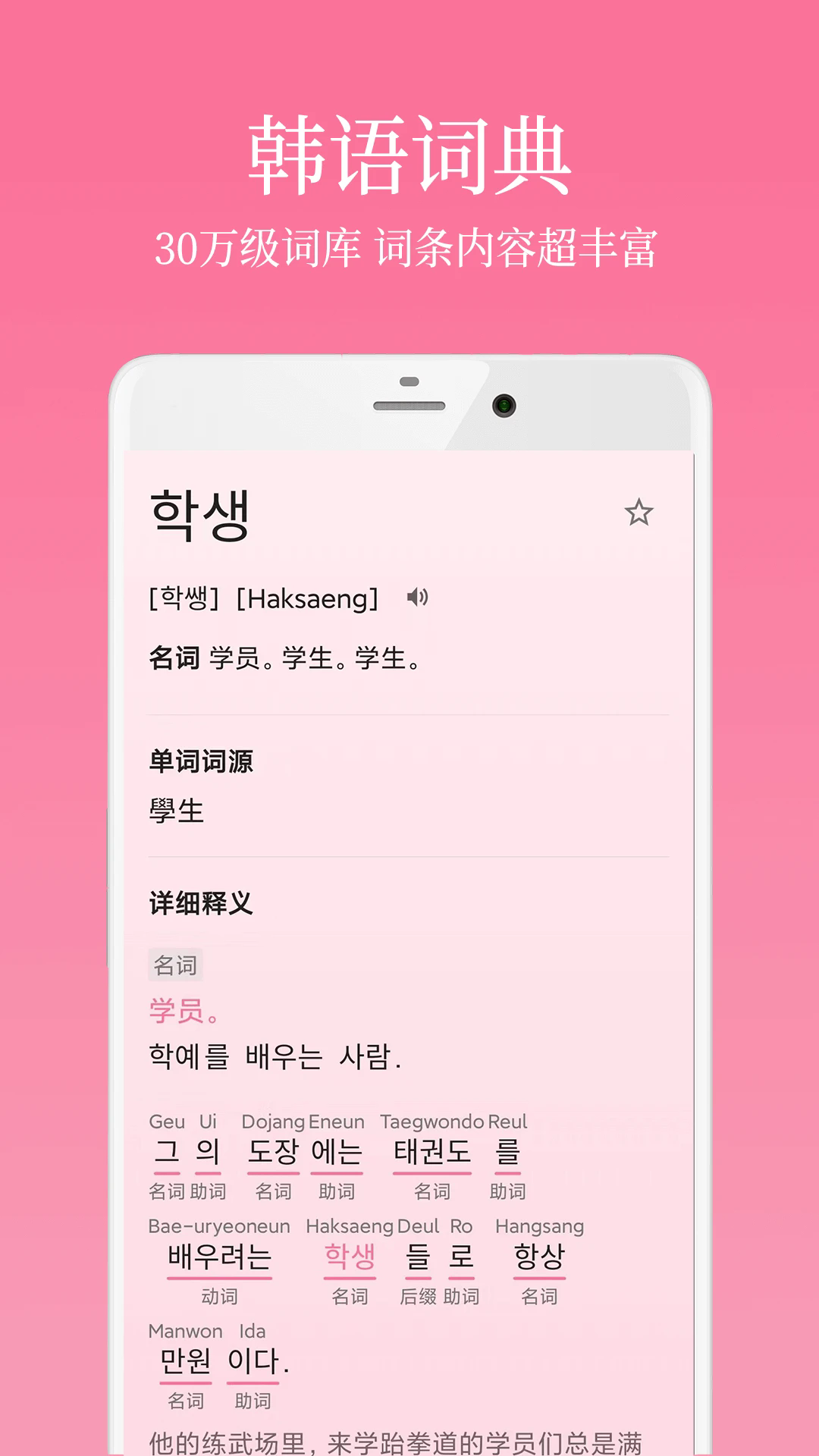 【30万级韩语词典】收录约30万韩语单词,查词全面又高效。支持中韩双向查询,提供丰富词条内容:单词词源、发音、罗马字、常用例句、近义词、反义词、……不仅查得快,更查得深。