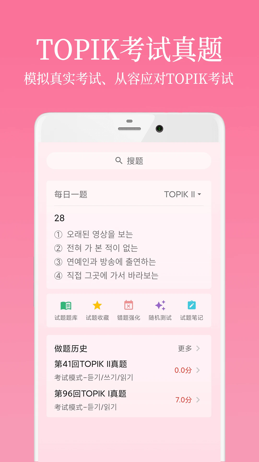 【韩语TOPIK考试】模拟真实TOPIK考试,每日一题、错题强化、随机测试和试题笔记等功能,让考试更从容。