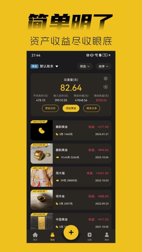 简单便捷的记账模式,金额换算等价黄金克重,记账更新颖;