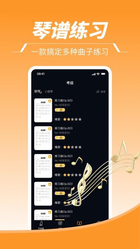 支持用户轻松实现琴谱练习,这里可以选择多首曲子来一键练习,轻松练习相关的琴谱。