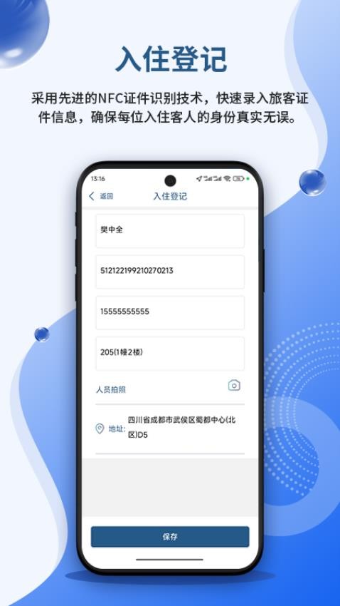 安旅宿app免费最新版是专为许多民宿、酒店打造的入住登记工具,以后可以通过软件快速的登记入住的旅客信息,这样就可以快速将旅客的入住信息保存起来,并且还可以通过平台查询入住数据,可以满足许多民宿、酒店和旅馆的入住登记需求,以后登记旅客资料会更加的简单容易。安旅宿官方版提供了非常快捷的证件识别登记模式,只要将身份证紧贴手机的NFC感应区,就可以快速的识别身份证信息然后快速登记,这样就可以省去许多复杂的步骤,登记旅客的数据就会更方便了,绝对可以满足许多旅馆、民宿和酒店的入住登记需求!