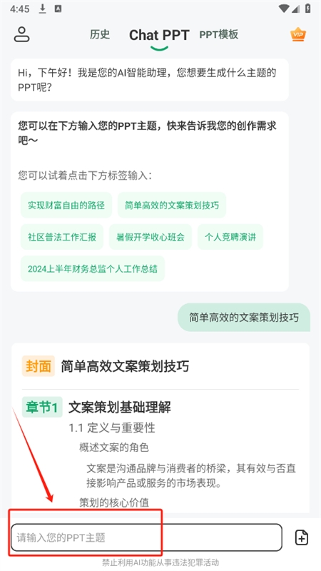 2.随时一句话一分钟就可以一键生成,轻松创建各种演示文稿