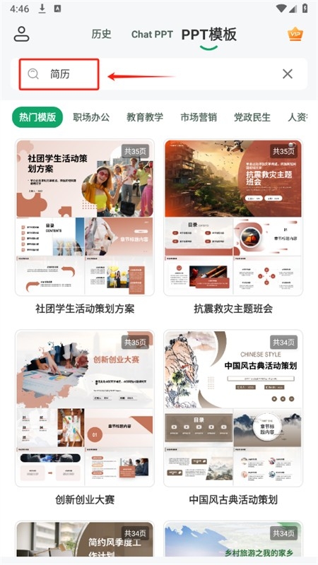 3、在PPT模板页面,搜索输入模版关键词,可以快速为您找到合适的模板