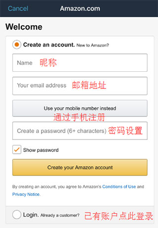 5、点击“Create an account”进入新账户注册页面,已有账户可以直接点击“Login”进行登录操作。在新账户注册页面输入昵称、注册邮箱地址及密码设置,密码需要大于6位字符。也可通过手机号注册,手机号注册需要进行短信验证码验证操作,而通过邮箱注册则无需进行验证,当然验证码接收速度还是比较快的,可以根据实际情况选择注册方式。