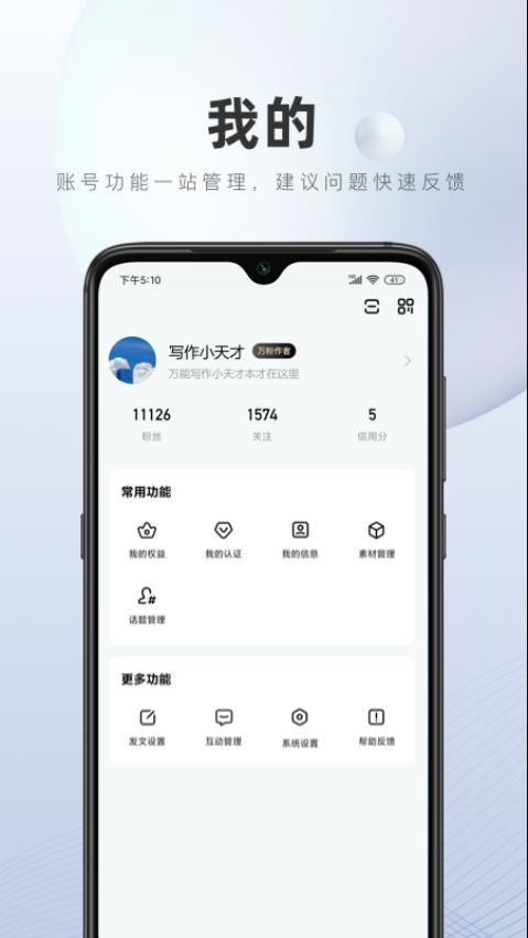 让创作者能在手机上便捷地发布和管理文章、图集、视频、直播平等内容;查看内容、收入和粉丝相关数据;随时随地查看粉丝评论、私信、关注、点赞、收藏和分享消息,实时接收平台公告和消息;查看和管理账号相关信息。更多功能,等你来探索。