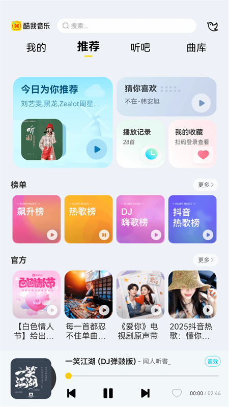 酷我音乐Pad版为用户提供了MV、电台、DJ、铃声、儿歌、影视、相声小品等丰富的内容,并且还有强大的搜索功能,让用户只需搜索即可轻松收听自己想听的内容。此外,该软件还能扫描播放本地高质量歌曲,给用户不错的离线音乐播放体验。